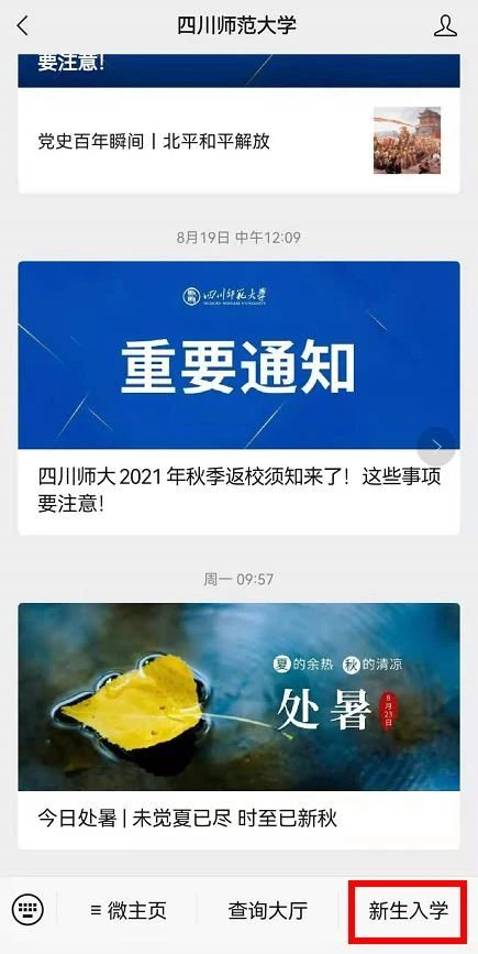 三、2021级新生需登录四川师范大学迎新专题网(yx.sicnu.edu.cn)或关注学“四川师范大学”微信公众号,认真阅读报到须知内容,并于8月20日起登录迎新专题网“网上报到”模块,填写和查询报到相关信息。用户名为14位考生号,初始密码为8位生日号码。