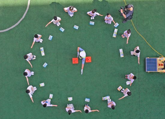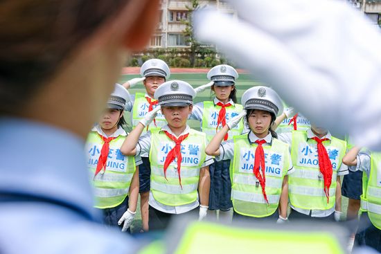 2021年8月29日,安徽铜陵,义安区实验小学,铜陵市公安局义安分局交警指导学生学习敬礼手势。