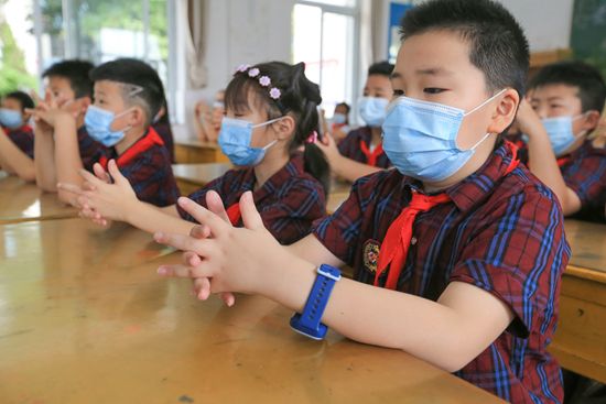 2021年8月30日,江苏连云港市东港小学四年级1班同学们在学习洗手步骤。