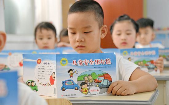 2021年8月30日,浙江省台州市仙居县第一小学一年级的学生认真观看“儿童安全出行”小册子。