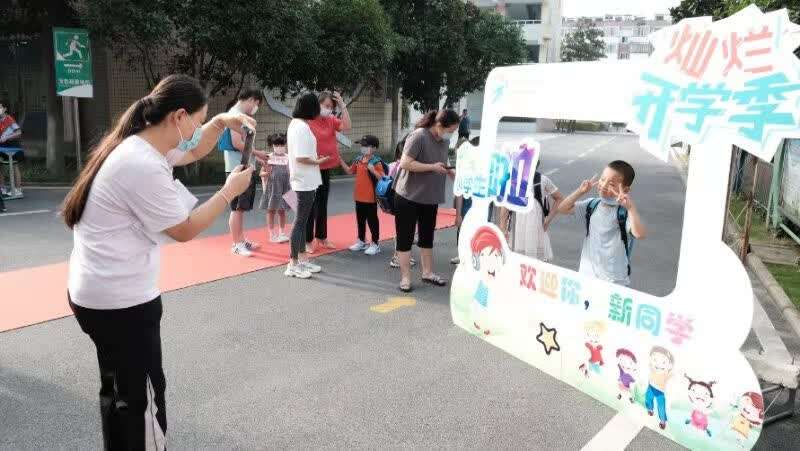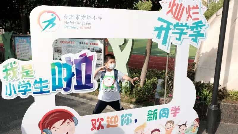 “嗨,方小桥,开学啦”!一句俏皮的欢迎词,让合肥市方桥小学的一年级新生感到亲切。在家长带领下,他们穿过七彩拱门,在卡通背景墙和留影展架前签名留影。