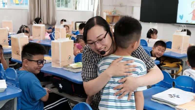 走进教室后,班主任老师欢迎学生的仪式是——一个爱的抱抱!方桥小学一(5)班班主任叶红说:给这些刚走出父母呵护的孩子一个爱的抱抱,让他们感受到从一个小家庭到一个大家庭的温暖。