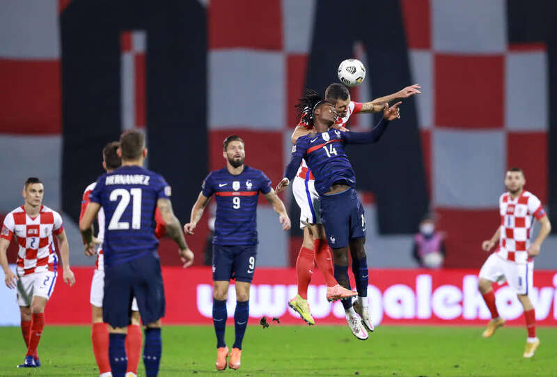 2020年10月14日,克罗地亚队球员洛夫伦(上)与法国的球员卡马文加在比赛中争顶。当日,在克罗地亚萨格勒布举行的欧足联国家联赛A级第3组第四轮的比赛中,克罗地亚队主场以1比2不敌法国队。新华社发(萨宁摄)