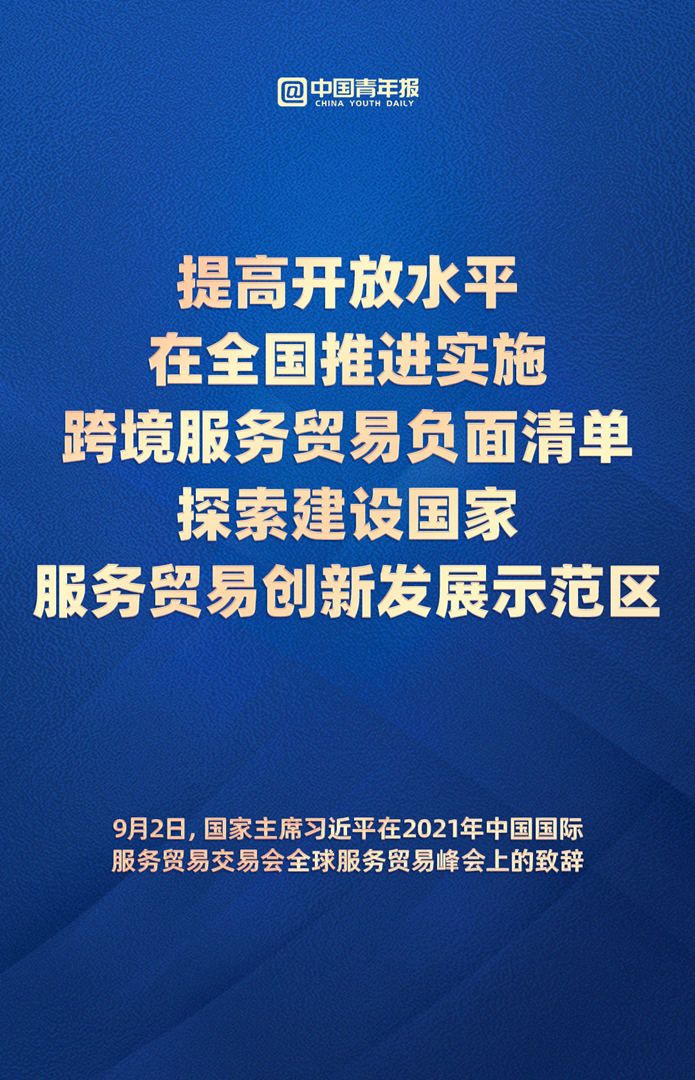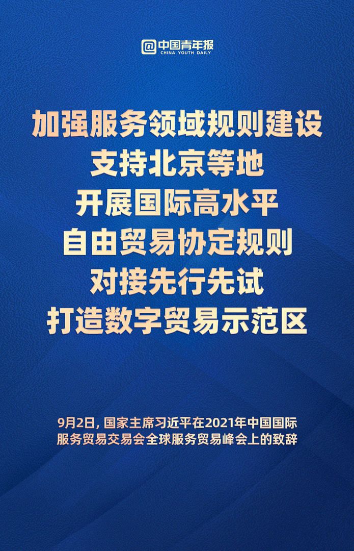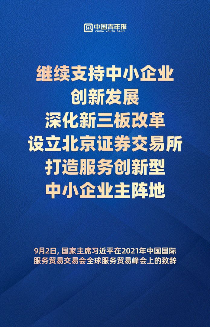 9月2日晚,国家主席习近平在2021年中国国际服务贸易交易会全球服务贸易峰会上发表视频致辞,发布设立北京证券交易所、探索建设国家服务贸易创新发展示范区等重磅政策。