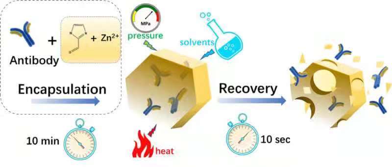 (图注:金属有机框架材料(MOFs)对抗体分子高效保护和便捷释放过程示意图。)