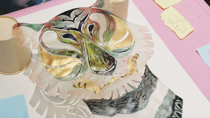 在今年上半年,在一场关于“童谣与非遗之美”的艺文乡野共创营中,汪海涛与插画师相互交流,相互传授技艺,以童谣为主题进行创作。汪海涛与动画艺术指导、视觉开发艺术家张弛一起根据童谣《我要吃老虎》创作了皮影面具。这件作品以三星堆出土面具形象为灵感,经过皮影雕刻与上色后,创作而成老虎形象面具。在汪海涛看来,皮影亦是表现插画的一种选择,“现在年轻人喜欢插画,如用皮影去表现,可以产生不同风格的作品,即有皮影本身带有的美感,也有炫酷的插画形象。”同时,在汪海涛看来,皮影也适合用于开发好的文创产品。