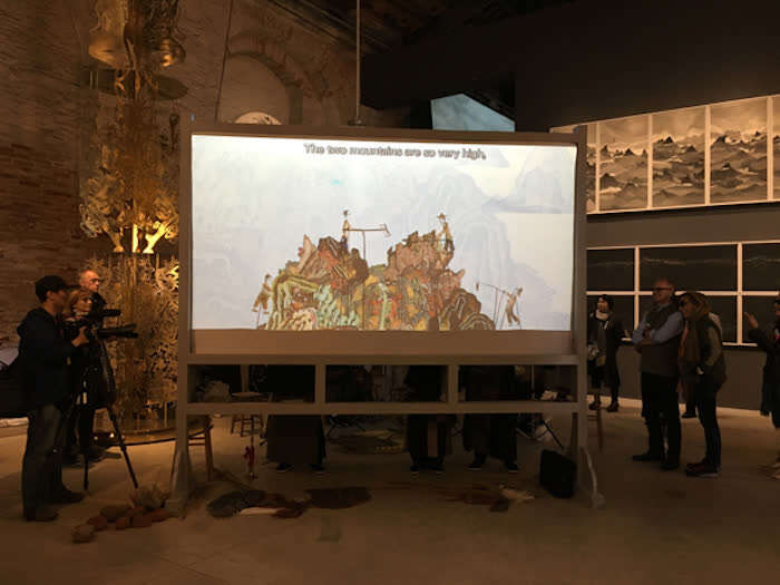 在展览现场,来自中国陕西华县的一组皮影艺人在幕布后面,弹着月琴、吹着唢呐,唱着悠扬的小调,并操作着皮影小人。在两边还有两个幕布:一个由威尼斯当地的中国留学生操作;另一个则是由机械装置操纵,展现鲲鹏变化的过程。尽管一些评论家对中国馆的策展方式有所褒贬,但展览本身也部分体现了当代艺术和民间艺术的现实处境,而皮影艺术的元素无疑是那届双年展最吸引人的亮点之一。