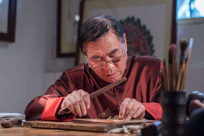 据说,入门要练三年功,汪天稳“推皮走刀”的基本功在师傅的严格要求下练习开来。用左手的食、中、无名三个指头推着皮子转,就是“推皮走刀”。这一技法看似简单,实则需要长久练习才能掌握好。