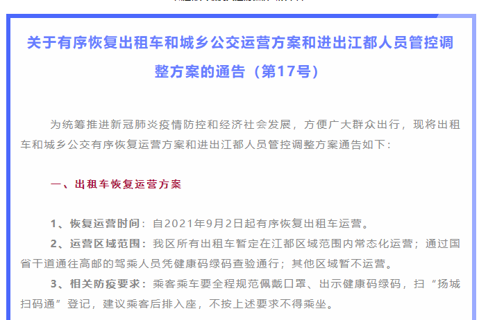 9月1日,江苏省扬州市江都区新冠疫情防控工作指挥部发布《关于有序恢复出租车和城乡公交运营方案和进出江都人员管控调整方案的通告(第17号)》,通告明确9月2日起,扬州江都城乡公交、出租车有序恢复,详情如下:
