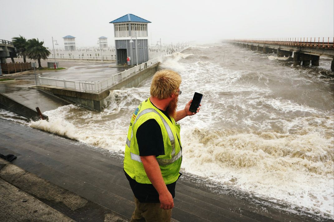 8月29日,密西西比州圣路易湾,一名码头工人在海堤旁拍照。
