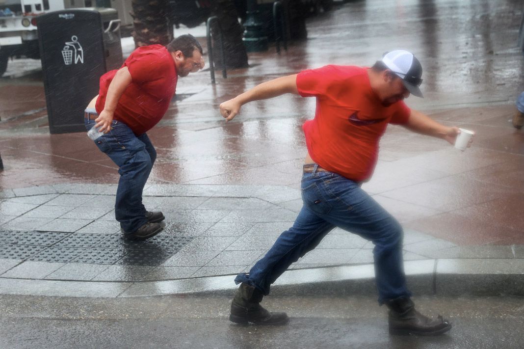 8月29日,路易斯安那州新奥尔良市,市政工人在雨中“凹造型”。