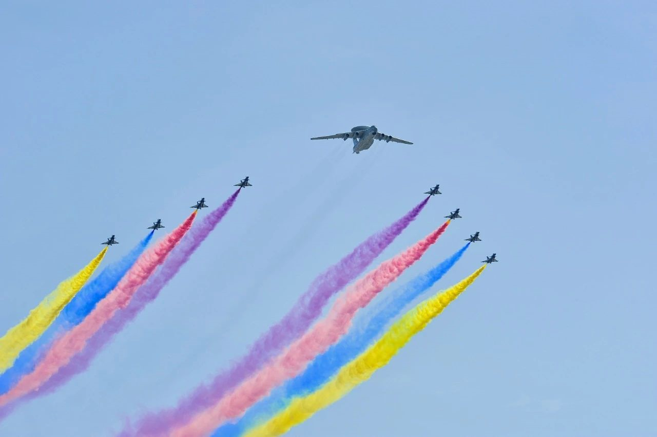 抗战胜利70周年阅兵,战斗机飞过天安门广场上空。
