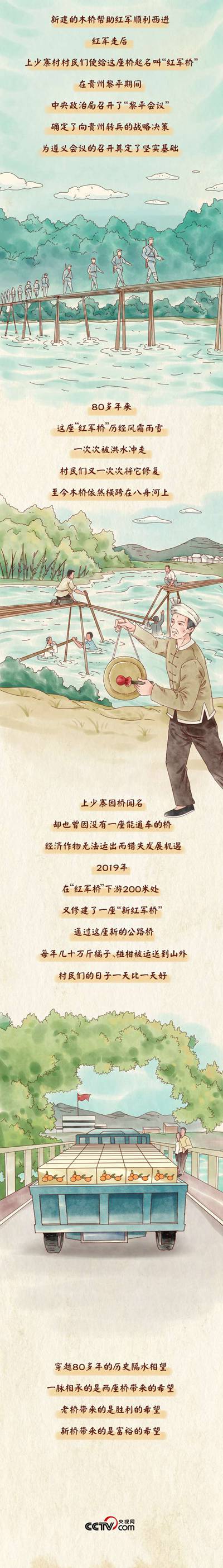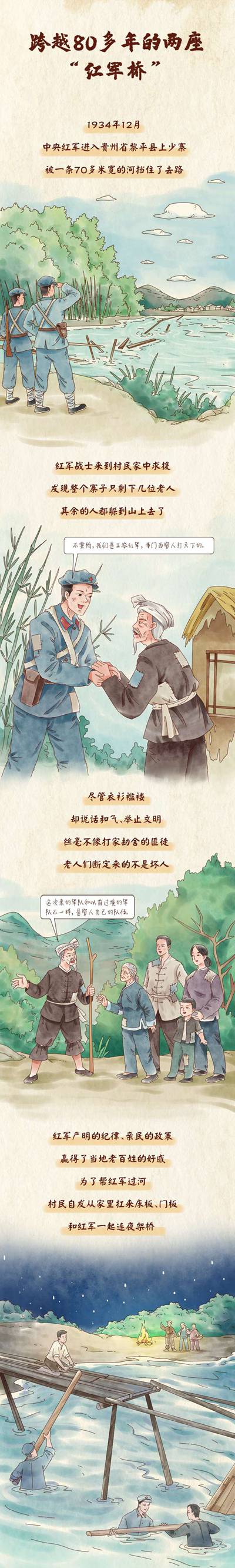 如今,在木桥下游200米处建起了一座能跑汽车的“新红军桥”。两座桥穿越80多年的历史隔水相望,一脉相承的是它们带来的希望,一座是胜利的希望,一座是富裕的希望。
