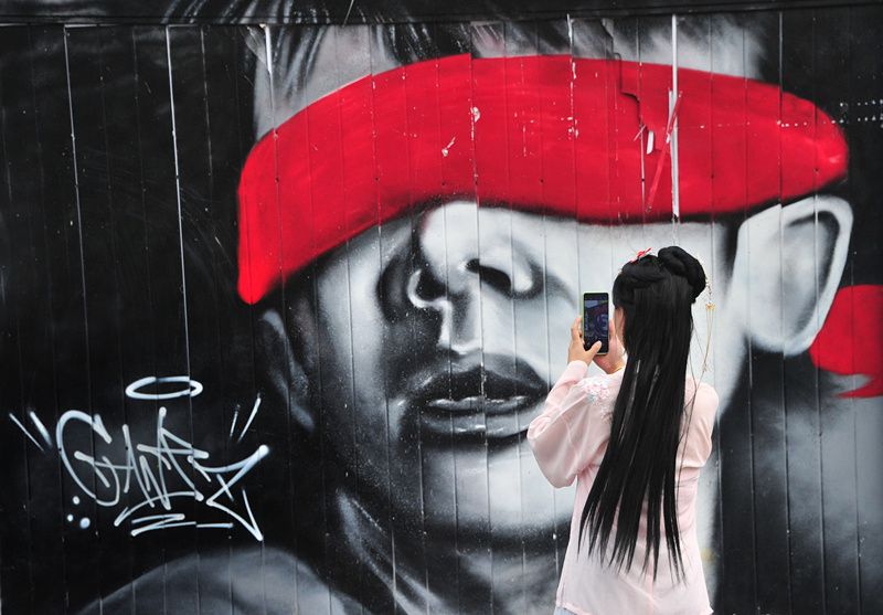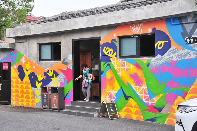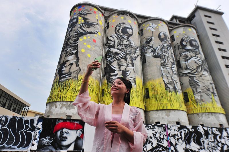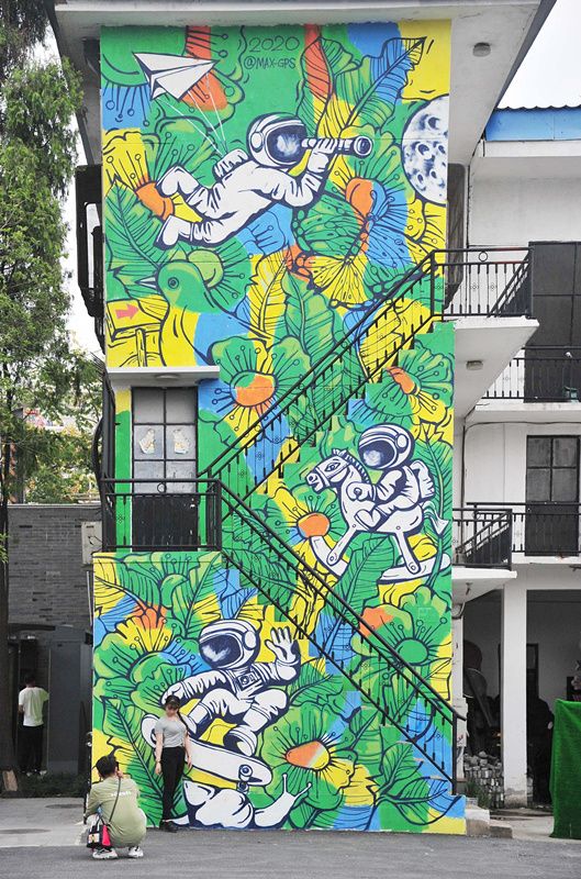 2021年9月5日,上海,松江的云间粮仓迎来不少游客。图为云间粮仓创意园区里时尚创意的墙绘涂鸦作品《太空花园》。