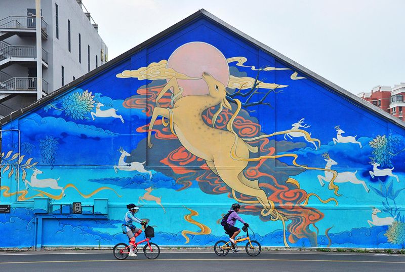 2021年9月5日,上海,松江的云间粮仓迎来不少游客。图为老厂房上的《十鹿九回头》墙绘作品再现了松江的民间历史传说故事。