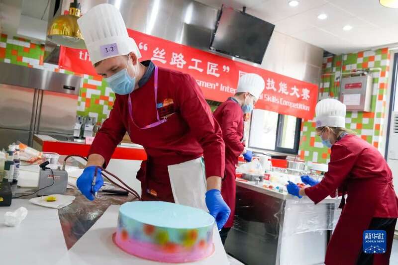 2019年6月26日,首届“丝路工匠”国际技能大赛的俄罗斯参赛选手在北京参加蛋糕裱花比赛。新华社记者 沈伯韩 摄