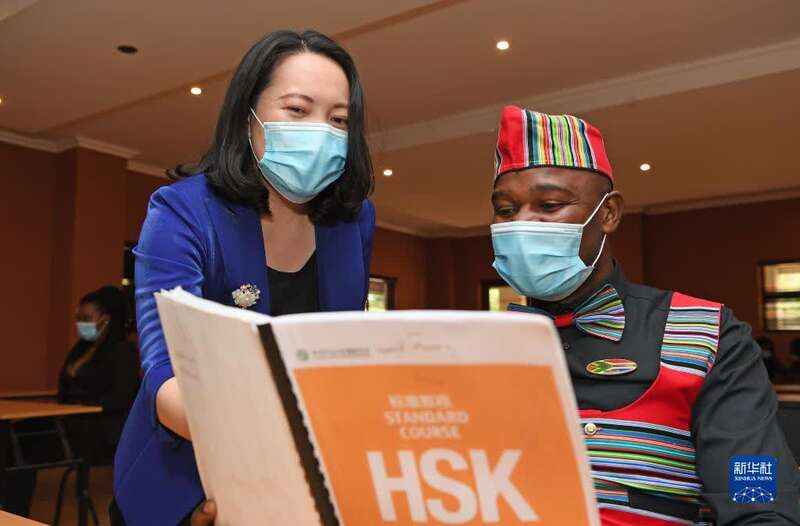 2021年3月18日,约翰内斯堡大学孔子学院院长彭奕(左)在南非比勒陀利亚为学员解答疑惑。新华社记者 陈诚 摄