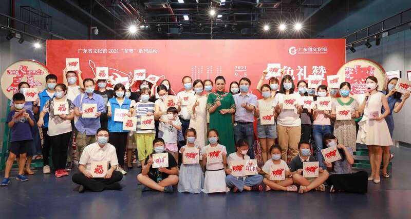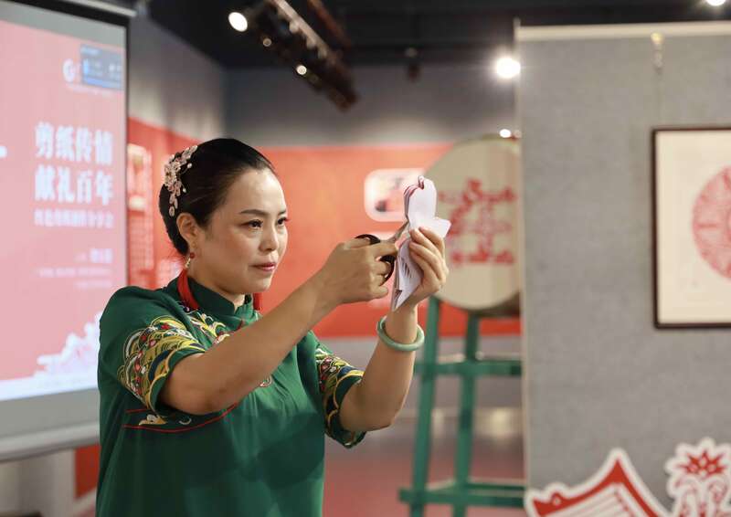 展览期间,广东剪纸(佛山剪纸)省级代表性传承人饶宝莲举办了“剪纸传情 献礼百年——红色剪纸创作分享会”。她阐述了国家级非遗广东剪纸深厚的人文内涵,分享如何用一张红纸剪出生动的红色故事,并在《梁祝》乐声中进行了即兴徒手剪纸表演。