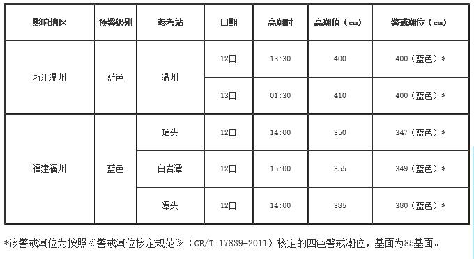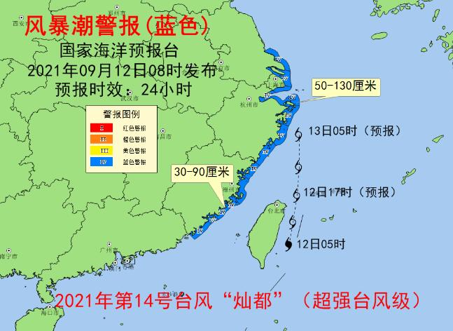 风暴潮方面,受今年第14号台风“灿都”(超强台风级)的影响,预计9月12日上午至13日上午,江苏南通至浙江温州沿海将出现50到130厘米的风暴增水,福建沿海将出现30到90厘米的风暴增水。上述岸段内的浙江温州潮位站将分别于12日下午和13日凌晨出现达到当地蓝色警戒潮位的高潮位,福建琯头、白岩潭和潭头潮位站将于12日下午出现达到当地蓝色警戒潮位的高潮位。浙江省温州市和福建省福州市的风暴潮预警级别为蓝色。