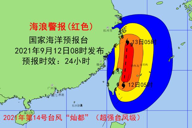 海浪方面,受“灿都”(超强台风级)的影响,预计9月12日中午到13日中午,东海、台湾以东洋面出现7到12米的狂浪到狂涛区,该近海海域海浪预警级别为橙色;浙江近岸海域将出现4到6米的巨浪到狂浪,该近岸海域海浪预警级别为红色;上海近岸海域将出现3到4米的大浪到巨浪,该近岸海域海浪预警级别为黄色;福建北部近岸海域将出现2到3.4米的中浪到大浪,该近岸海域海浪预警级别为蓝色。请在上述海域作业的船只注意安全,沿海各有关单位提前采取防浪避浪措施。