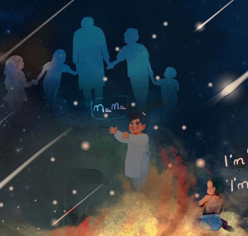 十颗流星,象征十条生命的陨落。七口棺材,里面是父母的宝贝。大哥哥与弟弟妹妹手拉着手走向天际,画面充满哀伤。
