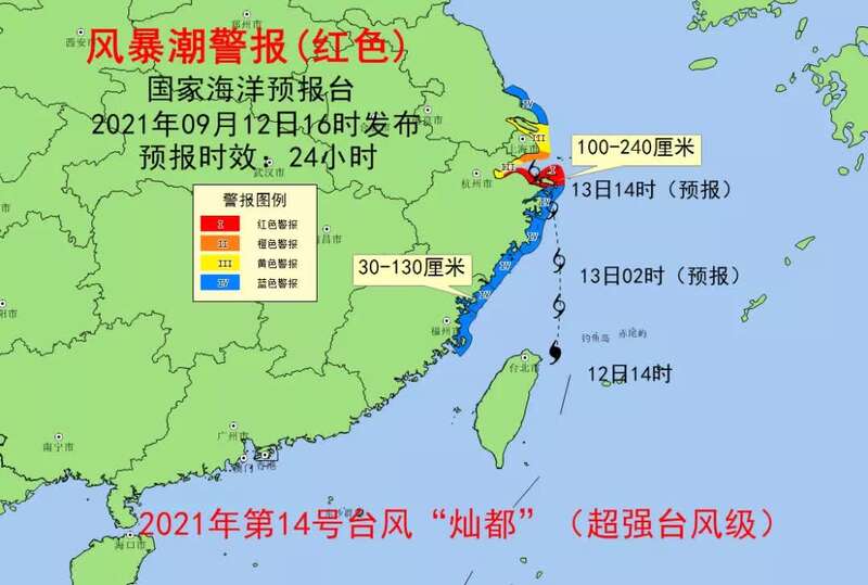 今年第14号台风“灿都”(超强台风级)的中心于12日下午17时位于浙江象山偏南方约430公里的东海南部海面上。预计9月12日夜间到13日白天,东海、台湾以东洋面出现7到12米的狂浪到狂涛区,该近海海域海浪预警级别为橙色;上海、浙江近岸海域将出现4到6米的巨浪到狂浪,该近岸海域海浪预警级别为红色;江苏南部近岸海域将出现2.5到3.5米的大浪,该近岸海域海浪预警级别为黄色;福建北部近岸海域将出现2到3米的中浪到大浪,该近岸海域海浪预警级别为蓝色。