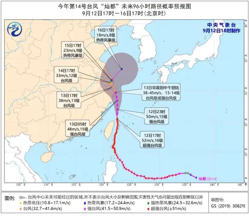 据中央气象台预计,“灿都”将继续向偏北方向移动,9月13日早晨到中午在浙江舟山到象山一带沿海登陆,或擦过舟山近海进入杭州湾,9月14-15日将在杭州湾附近海面或地区回旋少动,9月16日开始转向东北方向移动,强度逐渐减弱。