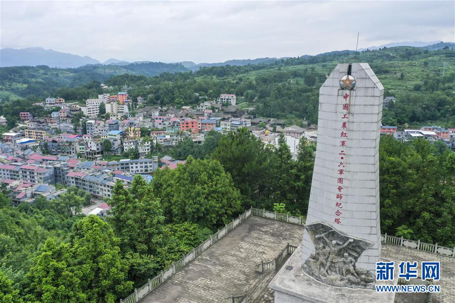 ▲2019年7月17日无人机拍摄,在重庆酉阳县南腰界镇拍摄的中国工农红军二、六军团会师纪念塔。新华社记者 刘潺 摄