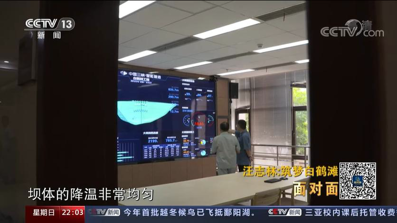 白鹤滩工程建设部主任 汪志林:我们专门研发了一套智能通水系统,以前通水就是坝土混凝土浇完以后,我们人工去测水温,然后再调我们通的水量。现在相当于装了一个大脑,它自己能够感知到我们坝体里面的温度,根据温度的不同,自动调解通水的流量,使得它降温。把温控防裂的工作做好了,我们当前的大坝浇到800米长的混凝土,没有发现一条温度裂缝,我们可以自豪地说现在整个大坝没有发现一条温度裂缝。