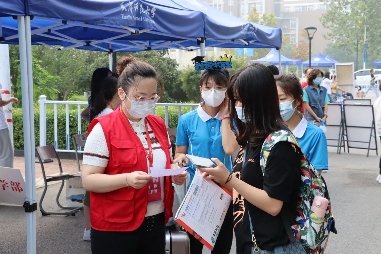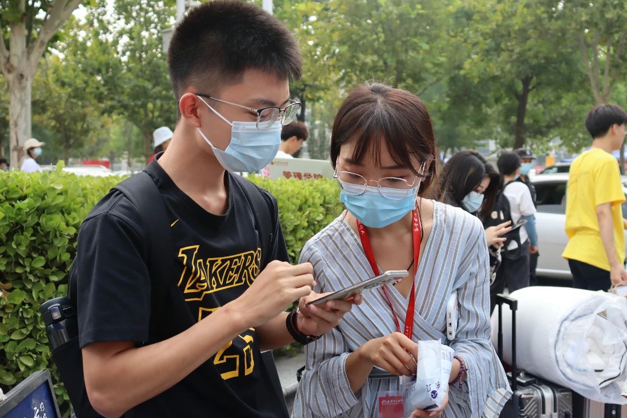 “欢迎你,新同学!”派发口罩、检查健康资料、行李消毒、搬运行李……迎新工作有条不紊地进行着。新生们最初的师大印象,除了美丽的校园,更多的是来自老师和学长学姐们的热情与体贴。外国语学院新生杨紫涵从志愿者手中接过行李,说道:“初来师大,对这里的一切事物感觉既陌生又新鲜,开始还有些害怕,但开学前就有特别热心的学姐联系了我,提供了细致的报道帮助,解答了我很多心中的疑惑。来到学校,老师和学长学姐都十分热情。天津师大给我的第一印象就是暖心!”
