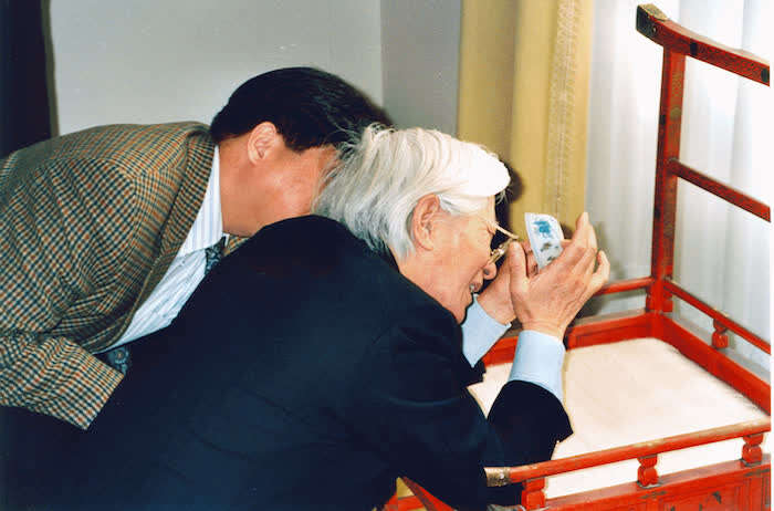 2002年3月,陈克伦与汪庆正先生(右)一起在日内瓦鲍尔文物馆考察成化斗彩。