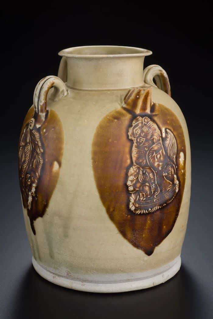 唐 长沙窑青釉褐斑模印贴花狮纹双系壶 新加坡亚洲文明博物馆藏
