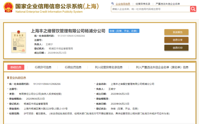 国家企业信用信息公示系统显示,因销售的甜虾被检出大肠菌群项目不合格,北极贝的菌落总数、大肠菌群项目不合格,上海丰之绪餐饮管理有限公司普陀分公司于2020年10月23日被普陀区市场监管局作出行政处罚决定,没收违法所得并罚款5万元。