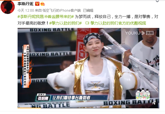 “拳击是一个非常有力量的运动,它会让人热血沸腾,充满能量。”9月17日,李斯丹妮在个人微博晒出了自己参加综艺《拳力以赴的我们》的视频,她写到“为梦而战,释放自己,全力一搏,是对拳赛,对对手最高的敬意!”并加上了“李斯丹妮我是冲着金腰带来的”话题,展现自己参加该节目的“野心”。