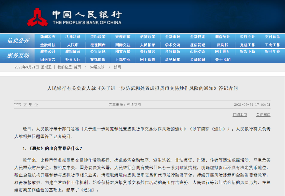 人民银行有关负责人就《关于进一步防范和处置虚拟货币交易炒作风险的通知》答记者问