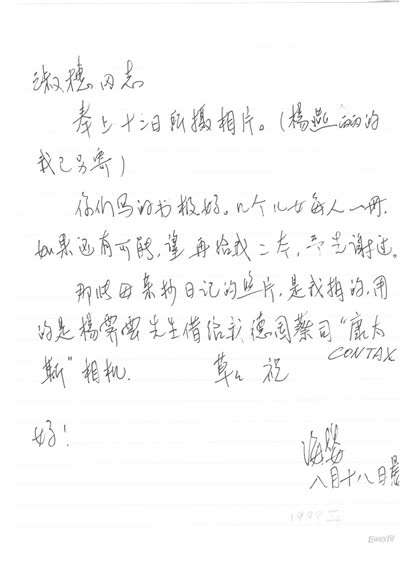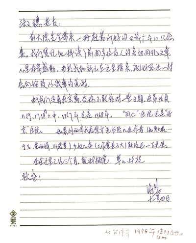 还有关于鲁迅的棺木到底是谁买的等等,诸如此类的问题,海婴同志都一一考证,求得史实的准确。再如为弄清“文化大革命”中鲁迅手稿遭遇的真相,他曾到监狱去找戚本禹,也曾访问过原北京卫戍区司令傅崇碧同志等等。他也曾非常仔细地多次纠正我写的稿件中史实的不准确,如1995年我在纪念许广平先生的《许广平》一书中写了一篇《难忘的恩泽 永远的怀念》,海婴同志在台湾看到这篇文章中的错误,特意写信给予纠正,信中写道:“由于我们没有在京寓,使妳不能核对一些日期,在第96页11行、17、18行之中,1967应是1968,‘同仁’医院应是‘北京’医院”(见海婴信1)等等,对于这些不准确的提法,他都从不放过。