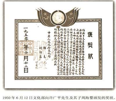 新中国成立后他和许先生将全部手稿、遗物、故居都献给国家,保存在北京、上海、绍兴、广州四个纪念馆里。这些遗物数量很大,可以说上世纪三十年代作家中能保存这样多遗物的,可能只有鲁迅一位吧!这些文物是我们国家千秋万代的财富,价值是无法估量的。这是他们母子的功劳,所以在1950年6月12日中央人民政府颁发的褒奖状中就写明:“许广平先生暨其子周海婴君以鲁迅先生故居全部捐献人民政府……”奖状最后还写到:“鲁迅先生是我国伟大的人民文学家思想家和革命家,兹许先生暨其子周君把他的故居和生前的文物公诸人民,使人民得以永远地参谒纪念。这种爱护鲁迅爱护人民的精神足资矜式,特予褒扬”等语,其中就明确提到海婴同志。