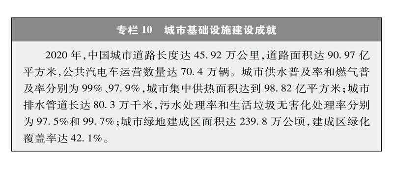 城镇化水平持续提高。城镇化是现代化的必由之路,是实现全面小康的幸福之路。新中国成立前,中国大地上城镇寥若晨星、衰败破落;今天的中国,城镇繁星璀璨、繁华时尚。中国经历了世界近现代史上规模最大、速度最快的城镇化进程,从1949年至2020年,常住人口城镇化率由10.6%提高到63.9%,城市数量由132个增长到687个,建制镇数量由2000个增长到2.1万多个。现代化国际化的大都市、厚重雍容的历史古都、典雅精致的文化名城、类型迥异的特色小镇,星罗棋布,城城不同,风景各异。城镇化的加快推进,形成了面积庞大、人口众多、联系紧密的城市群,成为经济发展和现代化建设的重要载体,提升了城市运行效率和居民生活质量。中国基本形成以城市群为主体、都市圈为依托,大中小城市和小城镇协调发展的城镇体系。