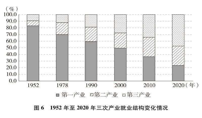 产业结构优化升级。中国已建成世界上最完整的产业体系,产业发展持续向中高端迈进。三次产业增加值之比从1952年的50.5∶20.8∶28.7到2020年的7.7∶37.8∶54.5,中国从传统农业大国成为工业大国、服务业大国(图3),中国经济从依赖单一产业为主转向依靠三次产业共同带动。农业现代化成效显著,机械化、数字化、绿色化、功能化、共享化水平明显提高,广大农民逐步告别“面朝黄土背朝天、一身力气百身汗”的辛劳,农村生产力极大解放;粮食生产能力稳步提升,实现谷物基本自给,中国人把饭碗牢牢端在自己手中。中国建成门类齐全、独立完整的现代工业体系,工业化和信息化融合发展的广度和深度不断拓展,“中国制造”向“中国智造”转型升级,产业链供应链现代化水平进一步提升。以新一代信息技术、生物技术、高端装备、绿色环保为代表的战略性新兴产业发展迅速,成为引领高质量发展的重要引擎。数字经济激发经济发展新活力,产业数字化和数字产业化趋势加快。现代服务业加速发展,以“互联网+”为标志的新业态、新模式层出不穷,平台经济、共享经济蓬勃兴起,生产性服务业向专业化和高端化发展,生活性服务业向精细化和高品质转变。产业结构的优化升级促进了经济更加均衡、更加充分的发展,人们个性化品质化多样化需求不断得到满足。