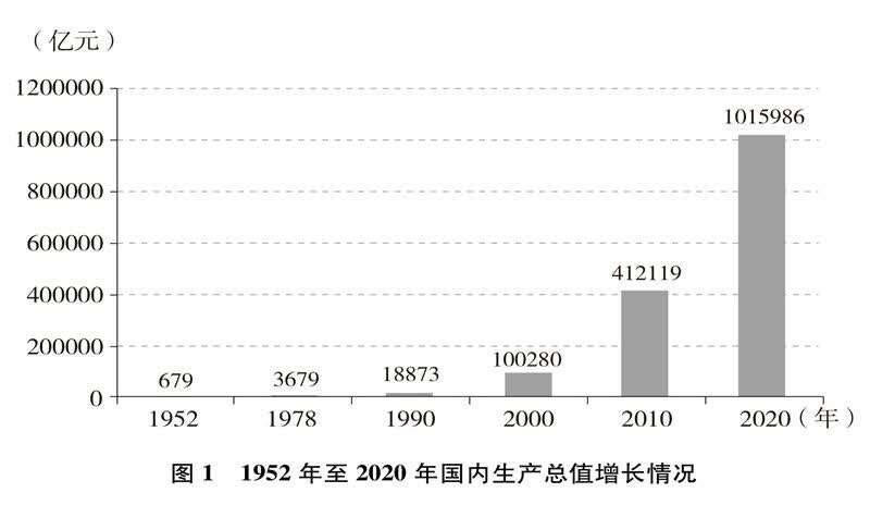 经济实力大幅提升。中国国内生产总值从1952年的679.1亿元跃升至2020年的101.6万亿元,经济总量占全球经济比重超过17%,稳居世界第二大经济体(图1)。人均国内生产总值从1952年的几十美元增至2020年的超过1万美元,实现从低收入国家到中等偏上收入国家的历史性跨越(图2)。制造业增加值多年位居世界首位,220多种工业产品产量居世界第一,自2010年起连续11年位居世界第一制造业大国。中国已是全球货物贸易第一大国、服务贸易第二大国、商品消费第二大国、外汇储备第一大国,2020年利用外资居全球第一。不断迈向共同富裕的14亿多人口,其中有超过4亿并不断扩大的中等收入群体,是全球最具成长性的超大规模市场,中国经济充满活力,具有巨大潜力和充足后劲。2020年,中国率先控制新冠肺炎疫情,率先复工复产,率先实现经济增长由负转正,充分彰显中国经济的强劲韧性。