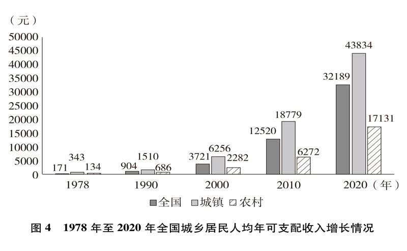 人民生活水平显著提高。居民收入持续增加,全国居民人均年可支配收入从1978年的171元增加到2020年的32189元(图4)。城乡居民恩格尔系数分别从1978年的57.5%、67.7%下降到2020年的29.2%、32.7%(图5),城乡居民生活质量不断提升。温饱问题解决后,人们对生活品质、品位有了更高的追求,衣食住行不断升级,消费结构从生存型逐渐向发展型、享受型过渡。衣,从穿暖到穿美、穿出时尚;食,从吃饱到吃好、吃出健康;住,从有所居到更敞亮、更宜居;行,从便利通畅到快捷舒适。吃穿用有余,家电全面普及,乘用汽车快速进入寻常百姓家。餐饮、健康、教育、旅游、文娱等服务性消费持续快速增长,在居民人均消费支出中占比逐渐达到一半左右。越来越多的人有“钱”有“闲”,“诗和远方”更加触手可及,“说走就走”不再是梦想,旅游扮靓人们的幸福生活,中国正在进入大众旅游时代。