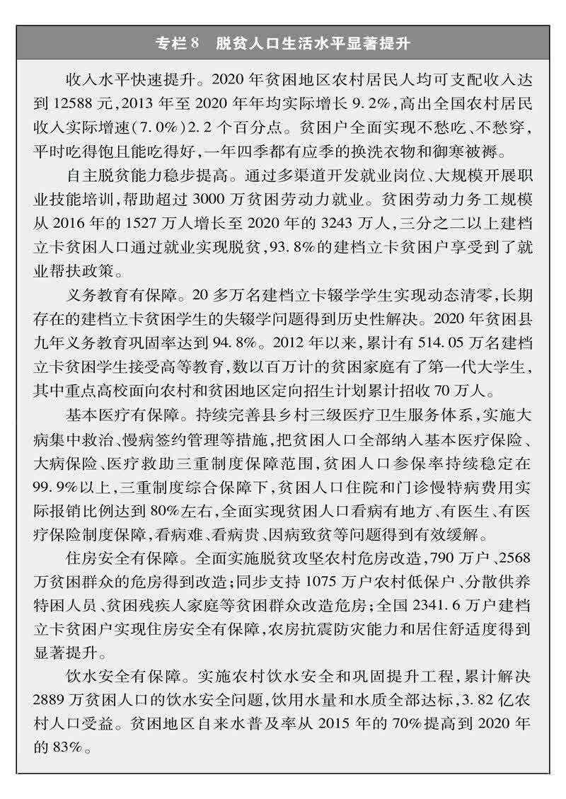 贫困群众与全国人民一道迈进小康。实施精准扶贫方略,做到扶持对象、项目安排、资金使用、措施到户、因村派人、脱贫成效“六个精准”,实施发展生产、易地搬迁、生态补偿、发展教育、社会保障兜底“五个一批”。到2020年底,中国如期完成新时代脱贫攻坚目标任务,现行标准下9899万农村贫困人口全部脱贫,832个贫困县全部摘帽,12.8万个贫困村全部出列。少数民族和民族地区脱贫攻坚成效显著,到2020年底,内蒙古自治区、广西壮族自治区、西藏自治区、宁夏回族自治区、新疆维吾尔自治区和贵州、云南、青海三个多民族省份3121万贫困人口全部脱贫;28个人口较少民族全部实现整族脱贫,一些新中国成立后“一步跨千年”进入社会主义社会的“直过民族”,又实现了从贫穷落后到全面小康的第二次历史性跨越。农村建档立卡贫困人口的收入和福利水平大幅提高,“两不愁三保障”全面实现,教育、医疗、住房、安全饮水等条件明显改善,既满足了基本生存需要,也为后续发展奠定了基础(专栏8)。从2016年起,通过大力实施易地扶贫搬迁,960多万居住在“一方水土难养一方人”地方的建档立卡贫困人口告别穷山恶水之地,易地搬迁,实现了脱贫。脱贫攻坚唤醒了贫困群众对美好生活的追求,提振和重塑了自力更生、自强不息、勤劳致富、勤俭持家、创业干事、创优争先的精气神,增强了脱贫致富的信心和劲头。脱贫攻坚任务目标完成后,对脱贫地区、脱贫人口实施跟踪监测,设立一定过渡期保持帮扶政策总体稳定,定期检查、动态管理,早发现、早干预、早帮扶,提升脱贫地区自主发展能力,激活脱贫人口自我发展动力,确保稳定脱贫、防止返贫。