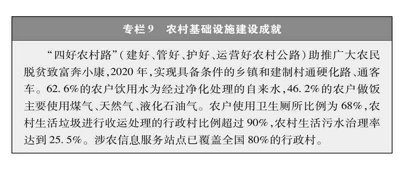 乡村走向繁荣发展。乡村振兴战略深入实施,农业全面升级、农村全面进步、农民全面发展的目标逐步实现。农业现代化加快推进,粮食和重要农产品供给保障能力进一步提升,粮食产量连续6年稳定在1.3万亿斤以上,果菜茶肉蛋鱼等产量稳居世界第一。农业综合生产能力稳步提升,农业科技进步贡献率超过60%,农作物耕种收综合机械化率达到71%。设立中国农民丰收节,中国农民有了自己的专属节日。以种植业为主的农业经济转变为农林牧副渔全面发展和一二三产业融合发展,农业农村多种功能不断拓展,特色生态产业、农村电商、乡村旅游、休闲农业、文化体验、健康养老等新产业、新业态加快发展,推动乡村产业走向全面振兴。农村基础设施建设持续加强,硬化路、动力电、4G网基本实现行政村全覆盖,农村物流水平稳步提升,快递基本实现“乡乡有网点”并加快“进村”步伐。越来越多的农村实现水源净化、道路硬化、夜晚亮化、能源清洁化、人居环境美化(专栏9)。农房和村庄建设现代化加快推进,厕所革命成效显著,乡村建设整体水平不断提升,许多曾经的偏僻穷困乡村,如今旧貌换新颜,村如公园、户有花园,成为农民宜居宜业的美丽家园。农村彻底扫除青壮年文盲,九年义务教育全面巩固、质量持续提高,人口素质显著增强。健康乡村建设全面推进,村卫生室标准化建设和健康管理水平进一步提升,农民健康水平和人均寿命大幅提高。从农家书屋、文化礼堂到健身广场,农民文化生活丰富多彩。农民的开放意识、创新意识、科技意识、法治意识、市场意识等现代观念显著增强,简朴节约、绿色环保、讲究卫生等科学、健康、文明的生活方式成为新追求,婚事新办、丧事简办、孝老爱亲、扶危济困、扶弱助残等社会风尚广泛弘扬,既有乡土气息又有现代时尚的新时代乡村文明新风正在形成。一个个山清水秀、文明和谐、宜居宜业、欣欣向荣的美丽村庄正渐次出现在中国大地上,农业强、农村美、农民富的目标不断实现。