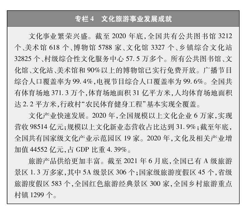 人民精神文化生活日益丰富活跃(专栏4)。从农家书屋、乡镇综合文化站,到城市公共图书馆、博物馆、文化馆、美术馆,覆盖城乡的公共文化设施网络持续完善,基本实现免费或低价开放,公共文化服务的丰富性、便利性、均等性显著增强。数字图书馆、公共文化云平台、“云端博物馆”蓬勃兴起,人们足不出户就能在线享受优质公共文化服务。文化产业持续健康发展,新型文化企业、文化业态、文化消费模式加速形成,网络文化产业迅猛发展,时尚的文化场馆、高质量的文化产品、具有创意的文化活动更好满足人们个性化多样化品质化国际化的文化需求。影视出版繁荣发展,“暑期档”“国庆档”“春节档”大片云集,精品图书不断呈现,人们享受越来越多的高品质文化盛宴。文化娱乐领域乱象有效整治,天清气朗风气正在形成。中外文化交流日益扩大,人们不出国门也能欣赏世界顶级文艺演出。文化与旅游融合发展,旅游景区、休闲度假、乡村旅游、红色旅游等旅游产品文化内涵不断提升,成为传播社会主义核心价值观的重要渠道、满足人民群众文化和旅游消费需求的重要方式、展示美丽中国的重要窗口,人们在行走中华大地、领略大好河山中感悟中华文化之美、陶冶心灵情操。全民健身热悄然兴起,从竞技体育到群众性体育活动,从国际赛事摘金夺银到闲暇时跳起欢快的广场舞,全民健身强健着民族筋骨、强大着民族力量,中国正在从体育大国迈向体育强国。