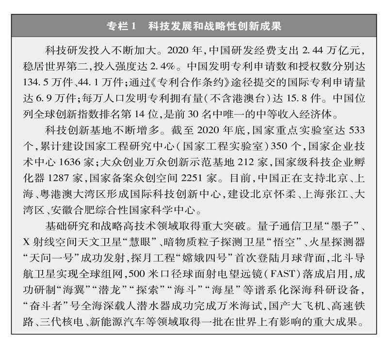 科技实力跨越式发展。科技支撑起小康梦。从新中国成立初期连火柴、铁钉都要依靠进口,到量子信息、铁基超导、中微子、干细胞、脑科学等前沿方向取得一系列重大原创成果,到载人航天与探月、北斗导航、载人深潜、高速铁路、5G移动通信、超级计算等一大批战略高技术领域取得重大突破,中国跻身创新型国家行列,正在从科技大国迈向科技强国(专栏1)。科技广泛应用于生产领域,创新驱动发展成效显著,科技进步贡献率超过60%。科技显著提升治理水平,数字政府、数字社会、数字乡村、智慧城市、“互联网+政务服务”等加快普及,网格化网络化智能化治理渐成常态。科技深刻改变人们的生活,网络点餐购物、移动扫码支付、网约车出行、共享单车出行、线上办公、在线教育、远程医疗、智能家居等,给人们带来的不仅是更多的便利,还有更充分的自由、更全面的发展。