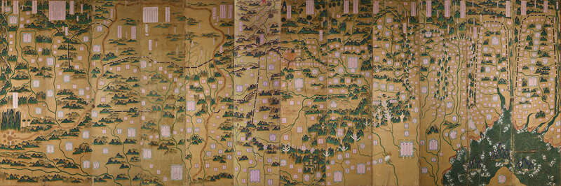 《九边图》屏的正面为绢本,粘贴于12块木板之上,画面整体采用写实的青绿重彩山水的画法绘简略地图。东起辽东半岛山海关,西至嘉峪关,其间边陲要地称“镇”者共九个,分别为:辽东镇、蓟州镇、宣府镇、大同镇、榆林镇、宁夏镇、甘肃镇、太原镇、固原镇,故名《九边图》。