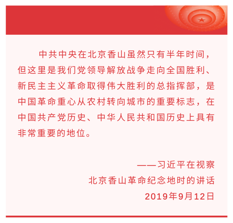 “钟山风雨起苍黄,百万雄师过大江。”作为中国革命胜利前夕党中央所在地,巍巍香山目睹了毛泽东等老一辈革命家指点江山、挥斥方遒的豪情,也见证了中国共产党人团结各界人士凝心聚力描绘新中国宏伟蓝图的艰辛和荣耀。