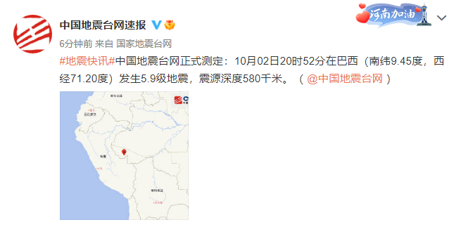 中国地震台网正式测定:10月02日20时52分在巴西(南纬9.45度,西经71.20度)发生5.9级地震,震源深度580千米。