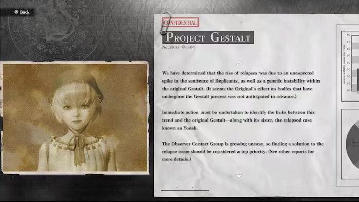 “格式塔”之名预示了计划失败的必然,剥离肉体与灵魂的行为导致新的病症出现,也就是崩坏与黑文病。失去肉体的灵魂随即开始崩坏,逐渐成为失去理智的崩坏体,而每当一个灵魂崩坏或死去,与之对应的“人工生命”复制体也会罹患黑文病,黑色文字逐渐布满全身,复制体在痛苦中死去。渴望肉体的灵魂与产生了自我意识的复制体,本出同源却彼此对立的两方为了生存权自相残杀。故事中复制体们误以为自己才是真正的人类,将渴望夺回身体的人类灵魂称为“魔物”。复制体尼尔不断屠杀魔物来保护村庄和妹妹,感慨患黑文病死去的村民越来越多,却从不知晓正是自己杀死魔物的行为加快了黑文病的蔓延。