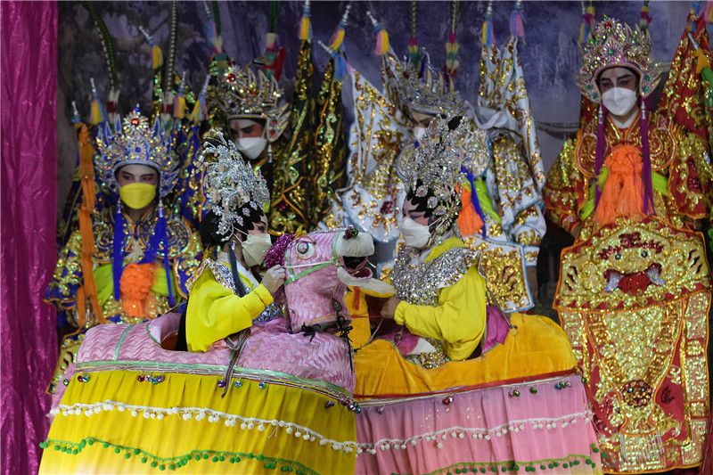 当地时间2021年10月6日,泰国曼谷,艺术家们佩戴口罩表演中国戏曲。